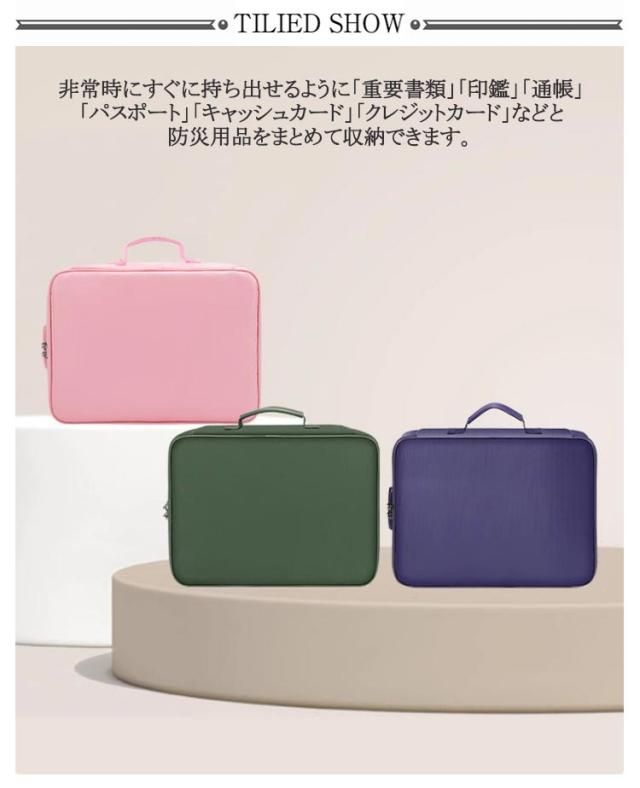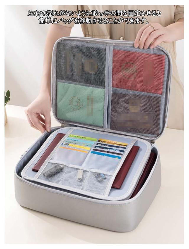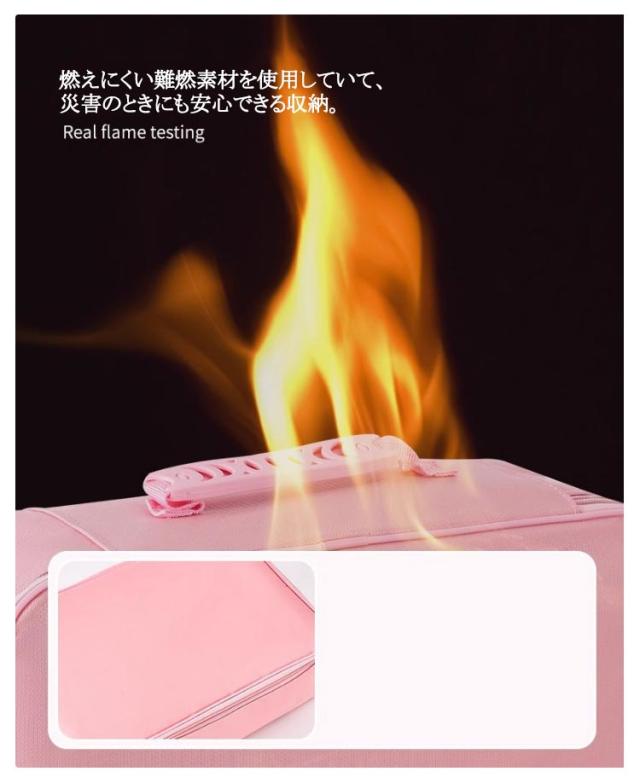 | 防火&防水機能 大切な書類を守る A4OK・多収納・ダイヤルロック 非常時にすぐに持ち出せるように「重要書類」「印鑑」「通帳」「パスポート」「キャッシュカード」「クレジットカード」などと防災用品をまとめて収納できます。 燃えにくい難燃素材を使用していて、災害のときにも安心できる収納。 汚れが吸着しにくい素材を採用して、ほこりが付きにくく、ベタベタ感もありません。 表面は撥水加工が施してあり、多少の水なら濡れても大丈夫! 左右の揺れがないように取っ手の間を固定させると簡単にバッグを移動させることができます | |