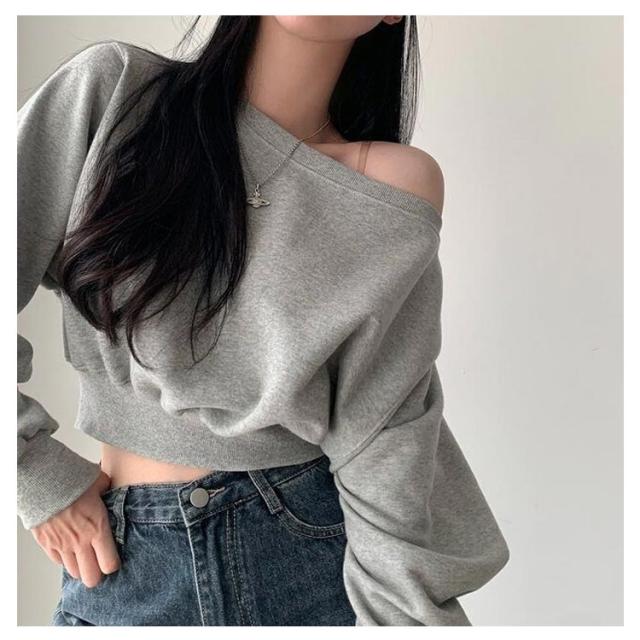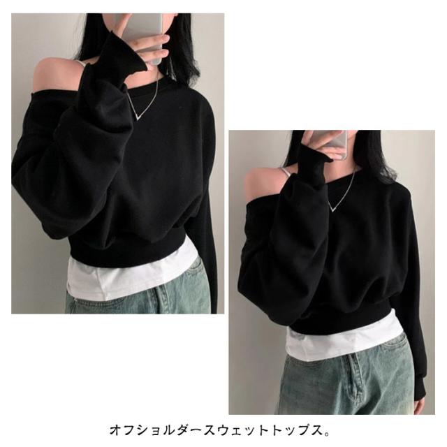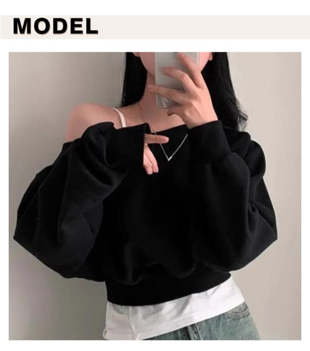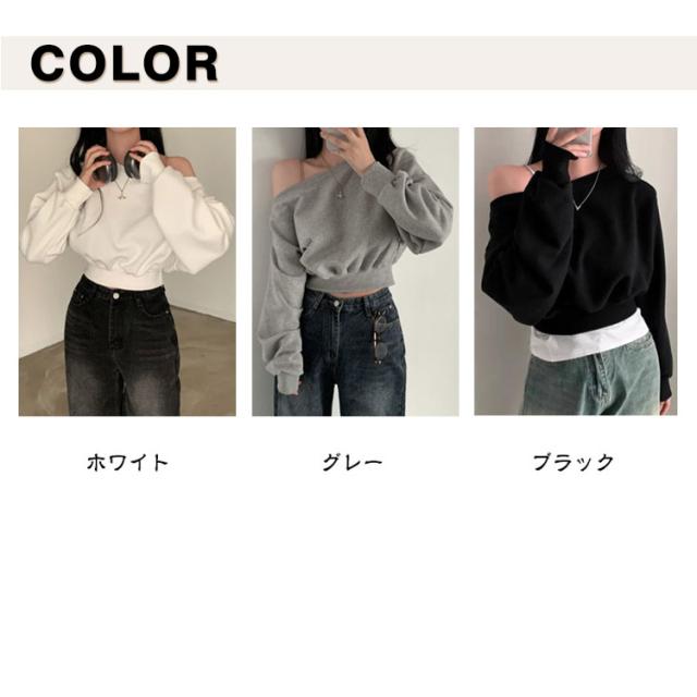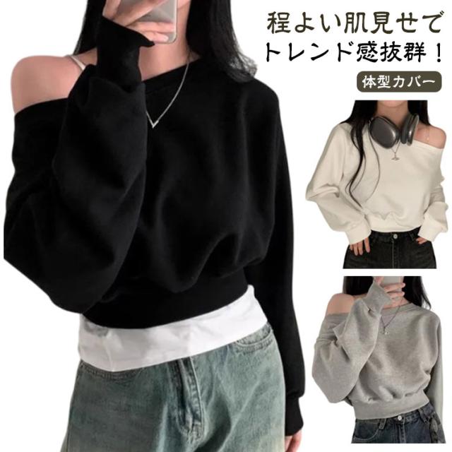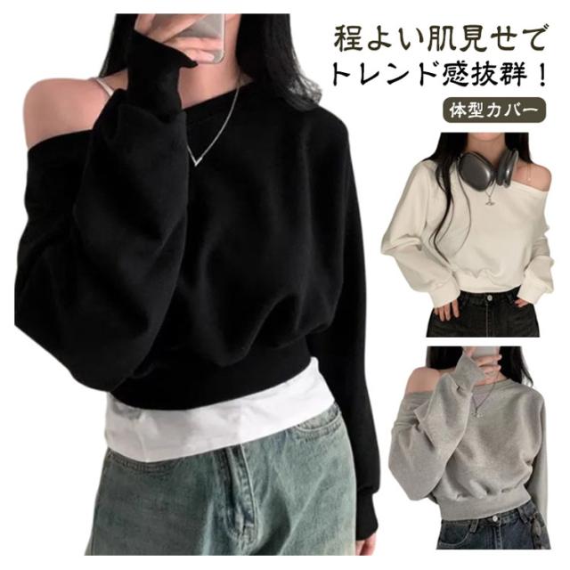 オフショルダー オフショルダー オフショルダー トップス 長袖 トレーナー 秋 春 レディース クロップド丈 ラウンドネック スウェット カットソー バルーンスリーブ tシャツ ゆったり カジュアル 無地 オーバーサイズ