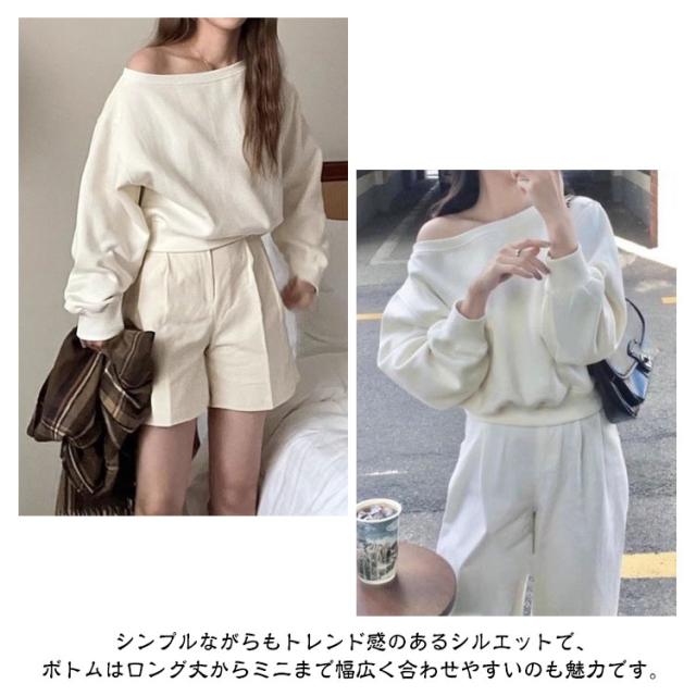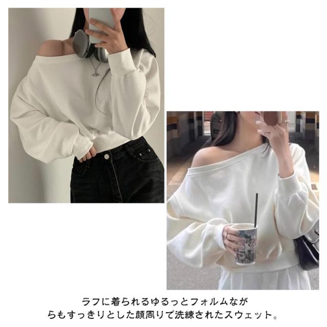 | 程よい肌見せでトレンド感抜群!オフショルダースウェットトップス。 シンプルながらもトレンド感のあるシルエットで、ボトムはロング丈からミニまで幅広く合わせやすいのも魅力です。 ラフに着られるゆるっとフォルムながらもすっきりとした顔周りで洗練されたスウェット。 | |
