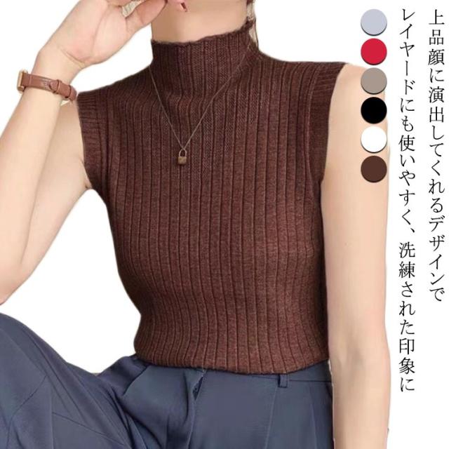 ノースリーブ レディース トップス タンクトップ プリーツ Tシャツ ニットトップス ハイネック シンプル ハイネックニット レイヤード ストレッチ 春 夏 秋 全6色 サマーニット