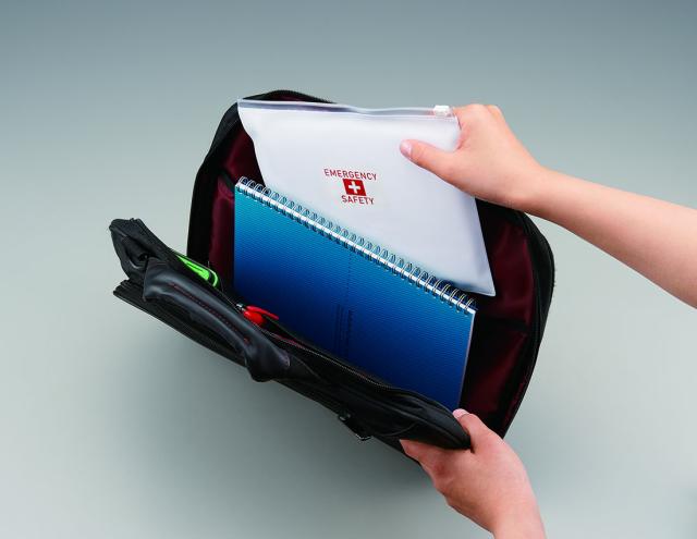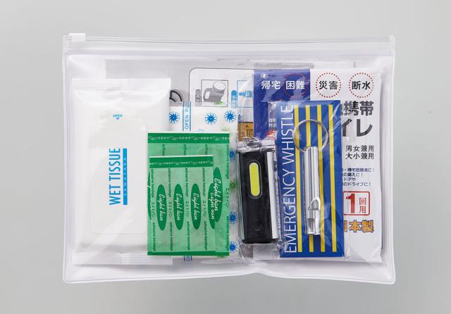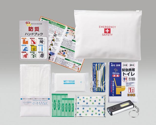 セット内容:スライダー付きポーチ、ウェットティッシュ(10枚)、携帯トイレ(大小兼用)1P、ポケットティッシュ、マスク、エイトバン(大小×各2)、ホイッスル、防災ハンドブック、2WAYフラットライト