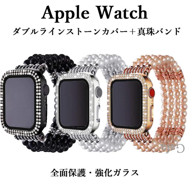 アップルウォッチカバーバンドセット Apple watchカバーバンド ダブルラインストーン強化ガラスカバー AppleWatch交換ベルト デコ 女性 レディースApple Watch 40mm 41mm 42mm 44mm 45mm 46mm 49mm アップルウォッチバンド ブレスレット 人造 真珠 パール 手作り