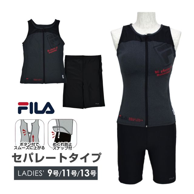 フィットネス水着 レディース セパレート FILA フルジップ スイムウェア めくれ防止杢ブラック