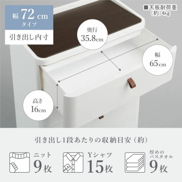 | 引出し1段あたりの収納目安 | ・トレーナー…9枚 ・Yシャツ…15枚 ・バスタオル…9枚 |