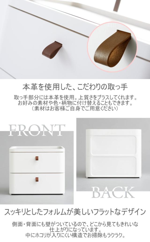 | 特徴 | 高級家具から着想を得た、ワンランク上のチェスト。 曲線的なデザインとマットな質感がお部屋をセンスアップしてくれます。 丸みのあるデザインなので小さいお子様のいるご家庭にもおすすめです。 リビングに、子供部屋に、洗面所に…様々な場所にマッチします。 気分に合わせて変えられるリバーシブル木天板。天板無しでもお使いいただけます。 背面と側面にフチがあるので後ろに物が落下する心配もありません。 貴重品を保管できる隠しトレーが1つ付属しています。(どの段にも取付できます。) 国内特許取得済みのオリジナル構造でたっぷり入れても引き出しの開閉がスムーズ。 取っ手部分には本革を使用。お好みの素材や柄物に付け替えることも可能です。 スッキリとしたフォルムが美しいフラットなデザイン。 中にホコリが入りにくい構造でお掃除もラクラク。 ■その他のチェストはこちら↓ その他のチェスト |