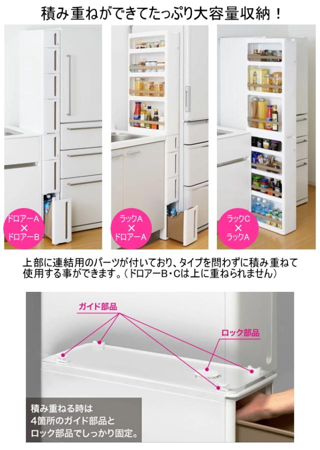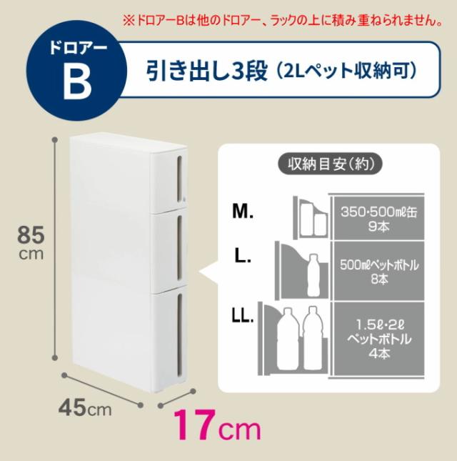 | 特徴 | お家のすきまをスッキリ、おしゃれに。 わずか17cmの隙間にぴったり収まり、たっぷり収納できます。 一般的なキッチンの高さに合わせた高さ設定(85cm)で見た目もきれいな仕上がりに。 落下防止ストッパー付きなので、引き出しを全部引き出しても落ちてきません。 完成品でのお届けなので組み立て不要。 2個積み重ねてご使用できます。 ※ドロアーB、ドロアーCは他のドロアー、ラックの上に積み重ねられません。 便利な仕切りケースつき。 お好みの色とタイプをお選びください。 ■その他の収納家具はこちら↓ 収納家具 |