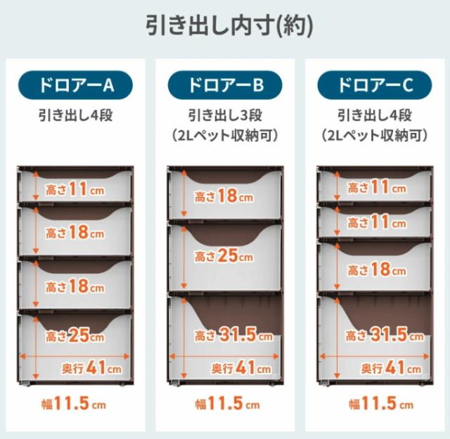 | 引き出し内寸 | S:(約)幅115×奥410×高110mm M:(約)幅115×奥410×高180mm L:(約)幅115×奥410×高250mm LL:(約)幅115×奥410×高315mm |