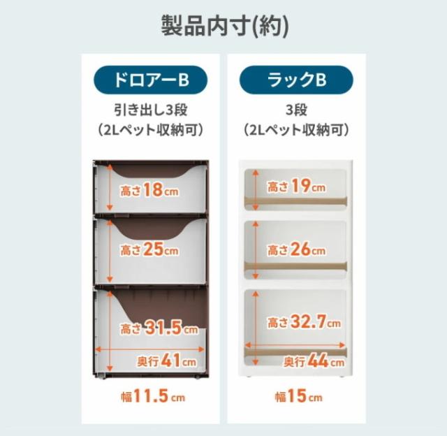 | 収納目安 | ●ラックB M:350・500ml缶×12本 L:500mlペットボトル×12本 LL:1.5・2Lペットボトル×4本 ●ドロアーB M:350・500ml缶×9本 L:500mlペットボトル×8本 LL:1.5・2Lペットボトル×4本 |