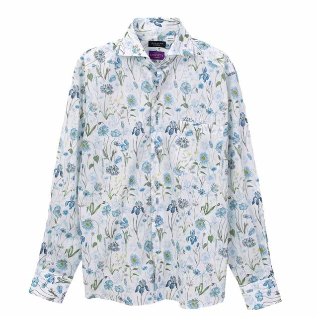 LIBERTY(リバティ)社のタナローン・オリジナルプリント生地を用いたドレスシャツ。LIBERTYの下げ札とルイスとリバティーのダブルネームが、その証となっております。スウィンギング・ロンドンのファッションミューズであり、映画スターでもあったジーン・シュリンプトンが着ていた花柄の衣装からインスピレーションを得た「メドゥ・ミューズ」。ポピー、ヒマワリ、アガパンサス、アイリス、デイジー、スノードロップ、チューリップ、ラベンダー、コスモスなど、植物の数々が繊細なイラストで描かれています。■商品の特徴リバティプリントの生地の代表ともいえるタナローン・綿100%生地。細番手の糸を用いて、薄手ながらもシルクのような手触りと艶をお楽しみください。ボタンは色縁のドーム型ボタンを使用。ボタン付け糸・ボタン穴かがりは虹のグラデーション糸を使用。前立の第2-4ボタンの間隔が狭くなっていますので、胸元の開きの調整が可能です。