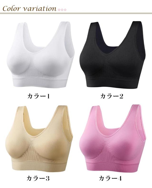 | 着心地抜群!24時間いつでもバストケアできる。 ノンワイヤーのナイトブラです。 バストをぐいっと持ち上げ、横流れをガード。 バストに持ってきた背中のお肉を着圧でがっちりガードします。 下から支えるパットでしっかり形をキープ!憧れのおわん型にサポートします 寝ても横流れせず、美しい谷間をキープできるので夜のバストケアに最適です! 締め付け感のない楽な着心地 伸縮性があり、なめらかな素材を採用。 しっかりフィットするのに締め付け感なし! 長時間動いても脇肉がはみ出にくい仕様になっています。 さらっとした素材で通気性抜群です! かわいい12色のくすみカラーから選べます。 | |
