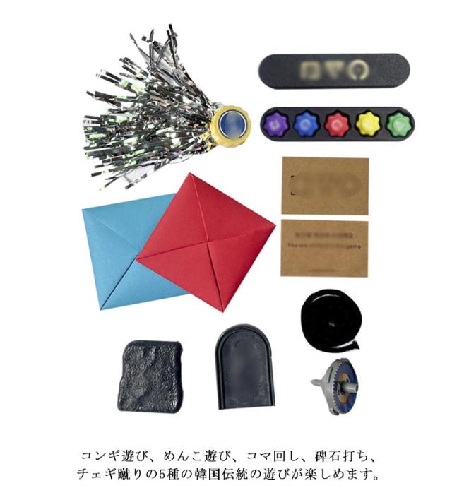 | 韓国の伝統的な遊びセット。ゲーム5種セット コンギ遊び、めんこ遊び、コマ回し、碑石打ち、チェギ蹴りの5種の韓国伝統の遊びが楽しめます。 | |