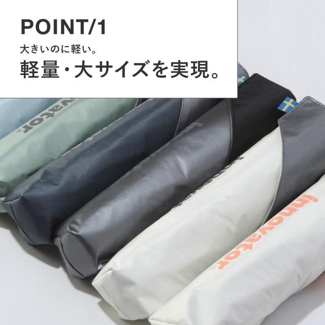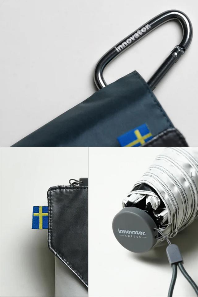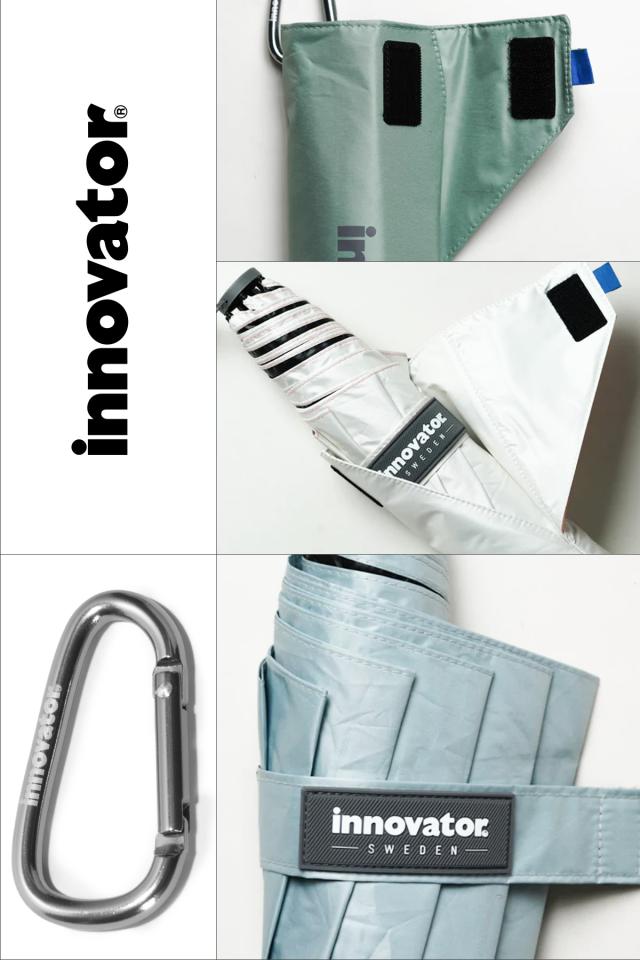 | 北欧の洗練されたデザイン【innovator - イノベーター】の 晴雨兼用 折りたたみ傘 ユニセックスなデザインは男女問わず使いやすく、アウトドアから通勤にまで幅広くお使いいただけます。収納袋は斜め間口の形状で傘の出し入れのストレスを低減するように工夫されています。ネームバンドにリフレクターが施してあり、夜道など暗い場所でライトが当たると反射して光ります。デザインと機能性を両立させたスタイリッシュな日傘兼用雨傘です |
