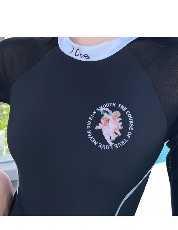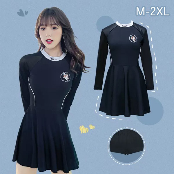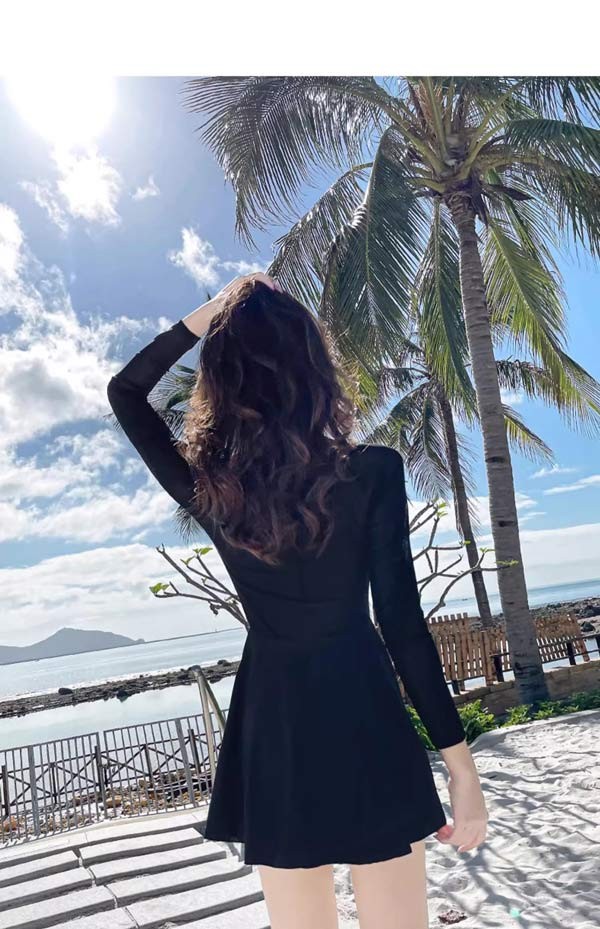 ワンピース水着 服みたいな 水着 長袖 無地 パッド付 レディース ラウンドネック 着痩せ シンプル セクシー 写真映え 撮影用 海 夏 サマー プール リゾート かわいい 旅行 温泉 大人 女性用 ジュニア 学生 女の子 ブラック