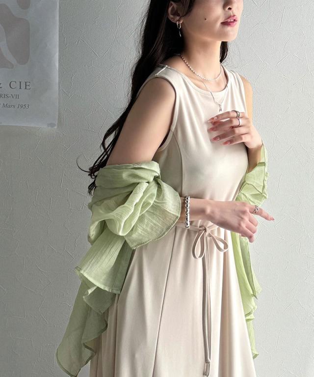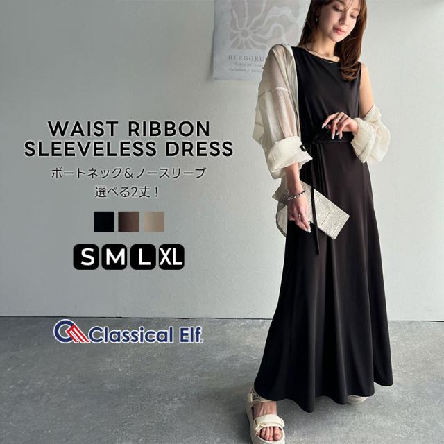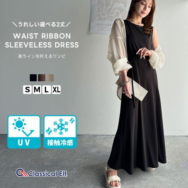 クラシカルエルフ春新作 ワンピース レディース ノースリーブ ボートネック ウエストリボン 選べる2丈 UVカット 接触冷感 防シワ加工付き カットジョーゼット素材 デイリー ウォッシャブル ひんやり ポリエステル100% 大きいサイズ 2026ss ce0940236