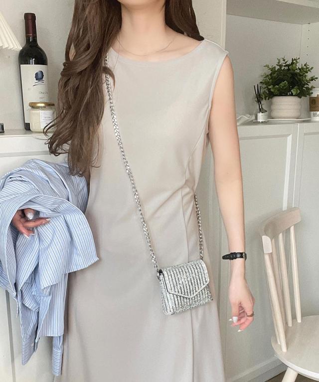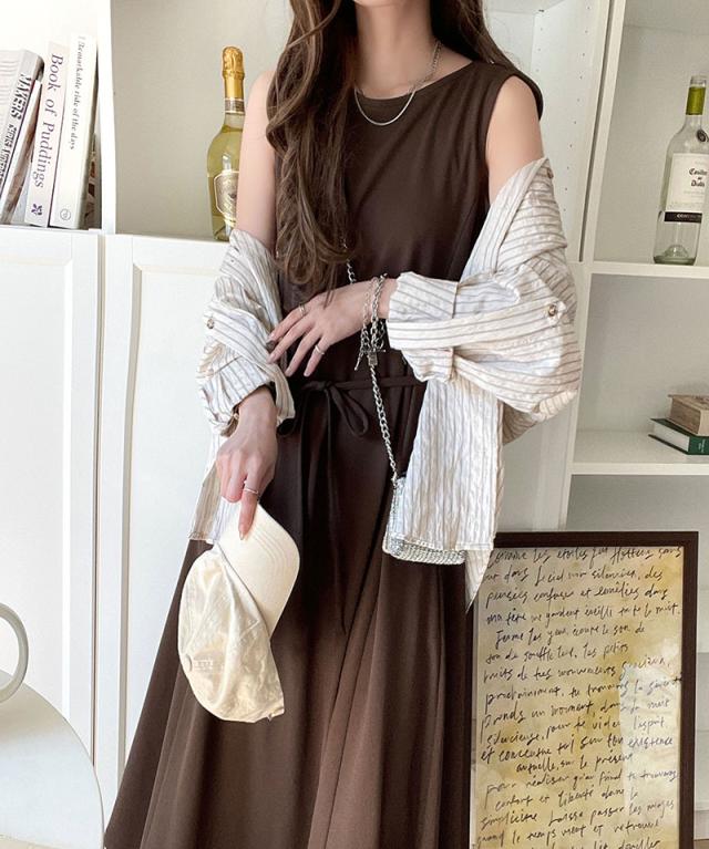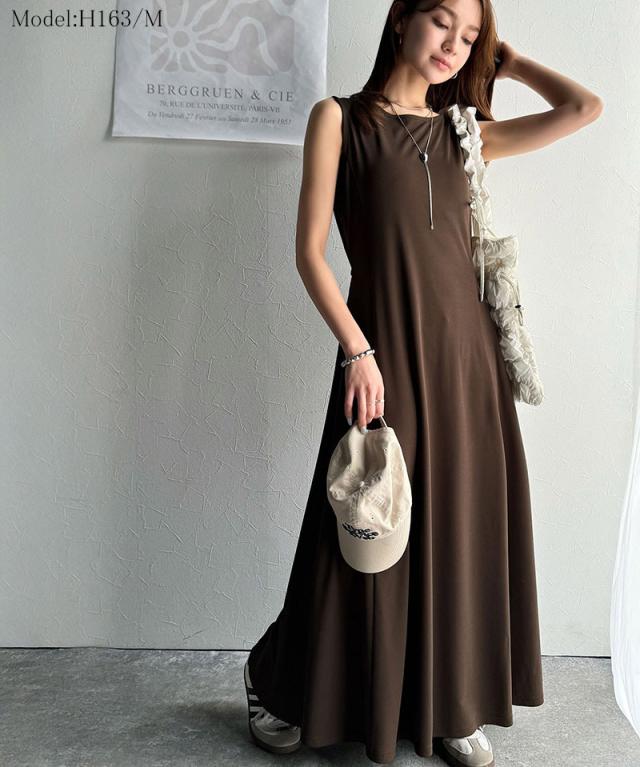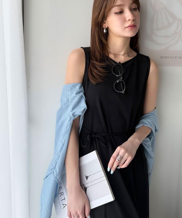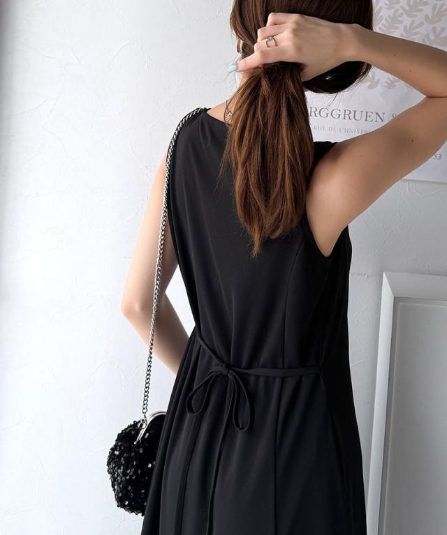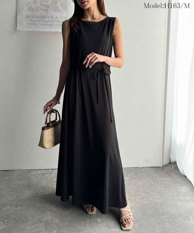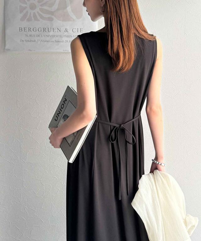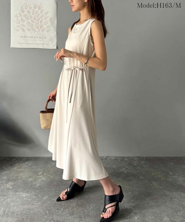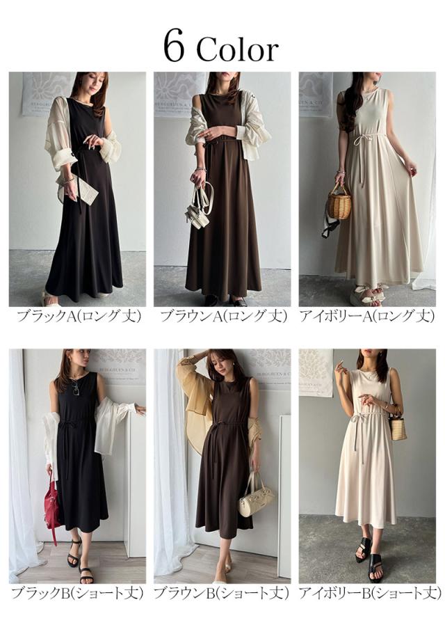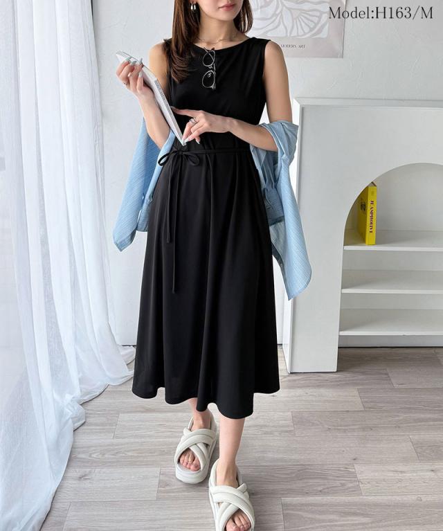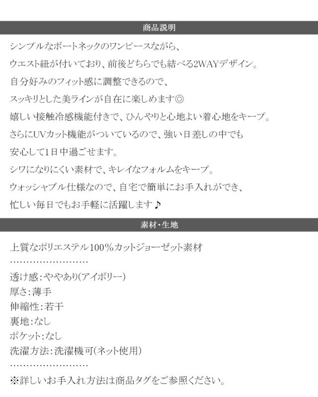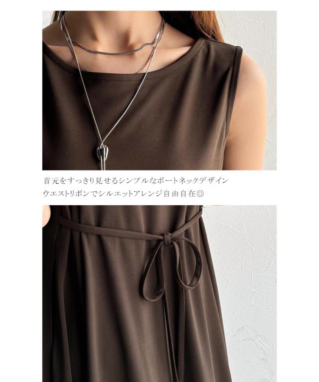 ★選べる2丈!ウエストリボン ボートネック 美ラインノースリーブワンピース(UVカット ・接触冷感・防シワ機能付き )★
