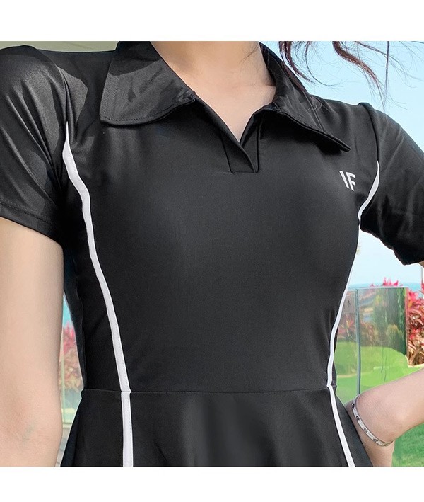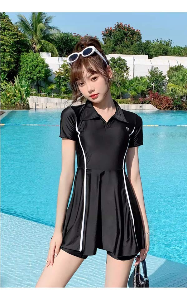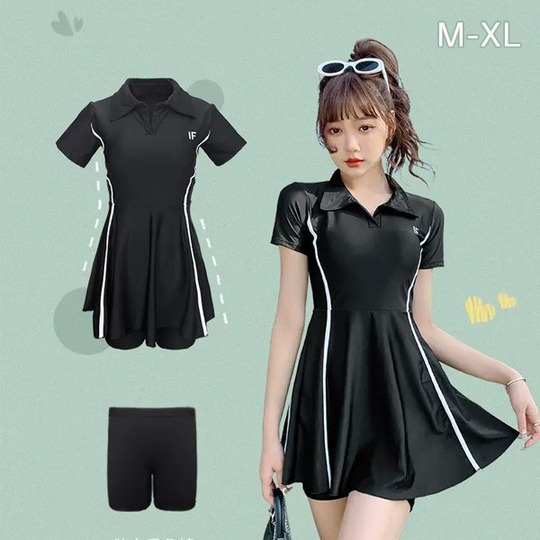 ワンピース水着 服みたいな 水着 2点セット 半袖 スポーツ風 ワイヤーなし パッド付 レディース 着?せ カジュアル シンプル セクシー 露出控えめ 写真映え 撮影用 海 夏 サマー プール リゾート かわいい 旅行 温泉 大人 女性用 ジュニア 学生 女の子 ブラック