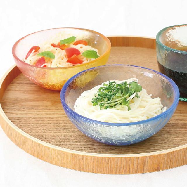 移ろいゆく空の色を表現したガラス食器、「空のいろどり」シリーズ。江戸硝子職人による手作りなので、毎日映す色を変える空のようにひとつひとつ違った表情が楽しめます。