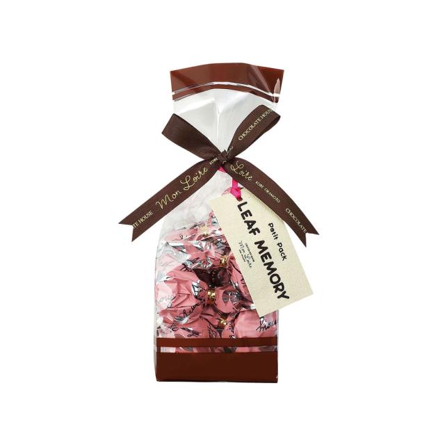プチシリーズの小さなギフトパック。好きなチョコを揃えたり、小さなプレゼント、ご自分用にも丁度いいサイズ。いろんなところで、大活躍の『プチパック』。“リーフメモリー”は、木の葉の形をした小さなチョコレート。巾着の中には、それぞれ違った3つの風味のチョコレートが包まれています。口溶けよく、上品な甘さです。内容量:9個入り 味:ミルク・クランベリー・キャラメル