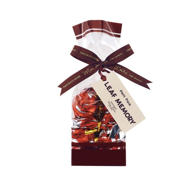 プチシリーズの小さなギフトパック。好きなチョコを揃えたり、小さなプレゼント、ご自分用にも丁度いいサイズ。いろんなところで、大活躍の『プチパック』。“リーフメモリー”は、木の葉の形をした小さなチョコレート。巾着の中には、それぞれ違った3つの風味のチョコレートが包まれています。口溶けよく、上品な甘さです。内容量:9個入り 味:ミルク・アーモンド・ピスタチオ