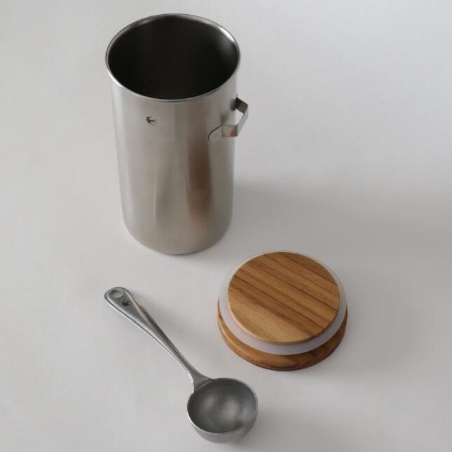 キャニスター:本体 ステンレス、ヘアライン仕上・木蓋 チーク材 スプーン: ステンレス、サテン仕上 |