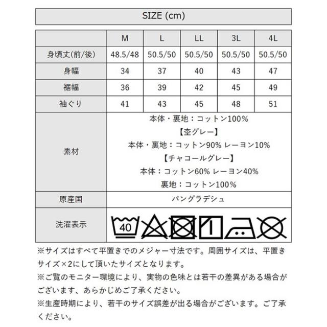 ■サイズ:[Mサイズ]身頃丈(前/後):48.5/48cm、身幅:34cm、裾幅:36cm、袖ぐり:41cm [Lサイズ]身頃丈(前/後):50.5/50cm、身幅:37cm、裾幅:39cm、袖ぐり:43cm [LLサイズ]身頃丈(前/後):50.5/50cm、身幅:40cm、裾幅:42cm、袖ぐり:45cm [3Lサイズ]身頃丈(前/後):50.5/50cm、身幅:43cm、裾幅:45cm、袖ぐり:48cm [4Lサイズ]身頃丈(前/後):50.5/50cm、身幅:47cm、裾幅:49cm、袖ぐり:51cm