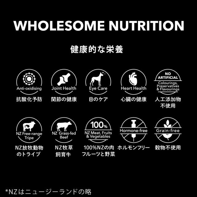 「ラム with グリーン トライプ 」は、動物性タンパク質源をブレンドしたもので、ニュージーランドの緑の牧草地で放牧されている放し飼いの子羊の肉を使用しています。