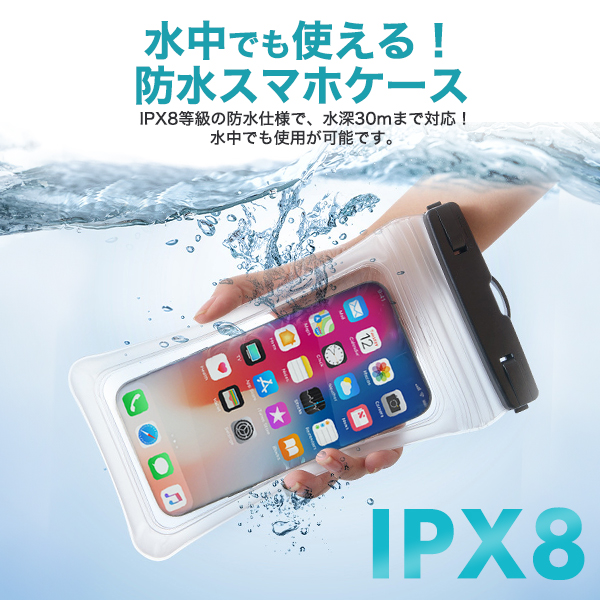 IPX8等級の防水仕様で、水深30mまで使用可能な防水スマホケースです。