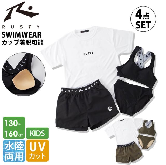 【20%OFF】 水着 キッズ 女の子 タンキニ 4点セット 可愛い セパレート 水陸両用 UVカット RUSTY ラスティ 子供 ジュニア 無地 ラッシュガード 付き ブランド ロゴ 夏 カップ付き 130 140 150 160 2025ss