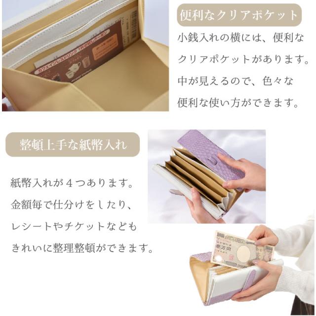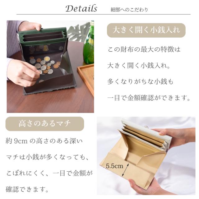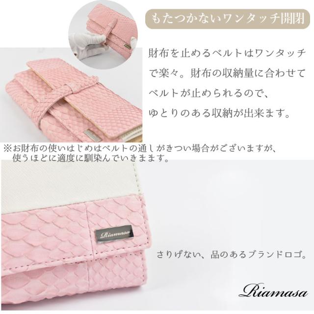 | 特徴 | 【訳あり品】 こちらは下記の理由により訳ありのため、在庫限りのお買い得価格となっております。 補修跡、革スレ、小傷、穴空き、汚れ、色ムラ等 普段使いに問題の無い程度ですが、一部の製品に見られるので大特価にて販売しております。 ※上記の理由での返品・交換はお受け致しかねます。 ご了承の上、ご注文頂きます様お願い申し上げます。 【マテリアル】 〜天然の優しい手触りと美しさ使うほどに美しい艶、色味に深みが生まれます〜 パイソン特有のひし形のウロコ模様は、しなやかで繊細な触り心地のため愛用者に好まれております。 皮革の丈夫さや大きさの点で流通し、形状や大きさも一枚一枚異なり、 牛革などにプリントしたパイソン型押し革にはない、まさに「唯一無二」の個性的な存在感を持ち合わせています。 【細部へのこだわり】 ●大きく開く小銭入れ この財布の最大の特徴は大きく開く小銭入れ。多くなりがちな小銭も一目で金額が確認できます。 ●高さのあるマチ 約9cmの高さのある深いマチは小銭が多くなっても、こぼれにくく、一目で金額が確認できます。 ●便利クリアポケット 小銭入れの横には、便利なクリアポケットがあります。中が見えるので、色々な便利な使い方ができます。 ●整頓上手な紙幣入れ 紙幣入れが4つあります。金額毎で仕分けをしたり、レシートやチケットなどもきれいに整理整頓ができます。 ●見やすく、使いやすいレイアウト 合計14個のカードポケットがあります。ポイントカードもクレジットカードも十分な収納が可能。また2つの大きなフリーポケットもあります。 財布を開ければ、ぱっと明るい配色で気分も明るく ●もたつかないワンタッチ開閉 財布を止めるベルトはワンタッチで楽々。財布の収納量に合わせてベルトが止められるので、ゆとりのある収納が出来ます。 |