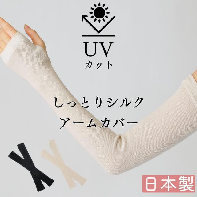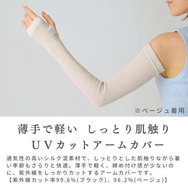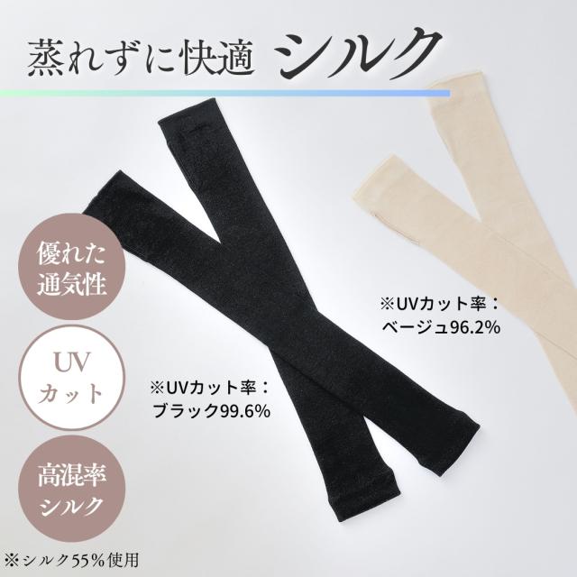 シルク アームカバー uvカット 日本製 ロング UVカット率99.6% ロング丈 総丈50cm レディース メンズ 通気性 さらさら しっとり 肌ざわり 紫外線カット 日焼け対策 紫外線対策 UPF50+ ベージュ ブラック