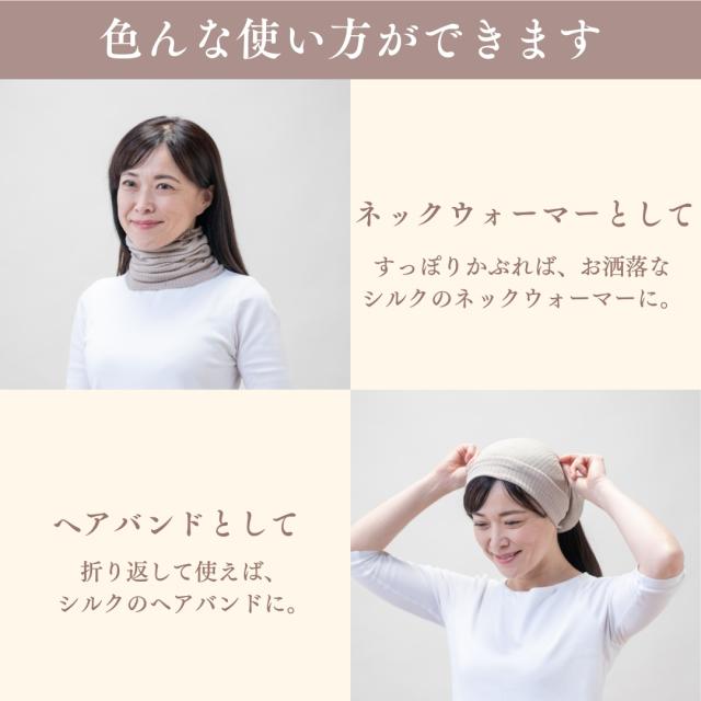 高品質なシルクのネックウォーマーやヘアバンドとしてもご使用いただけます。
