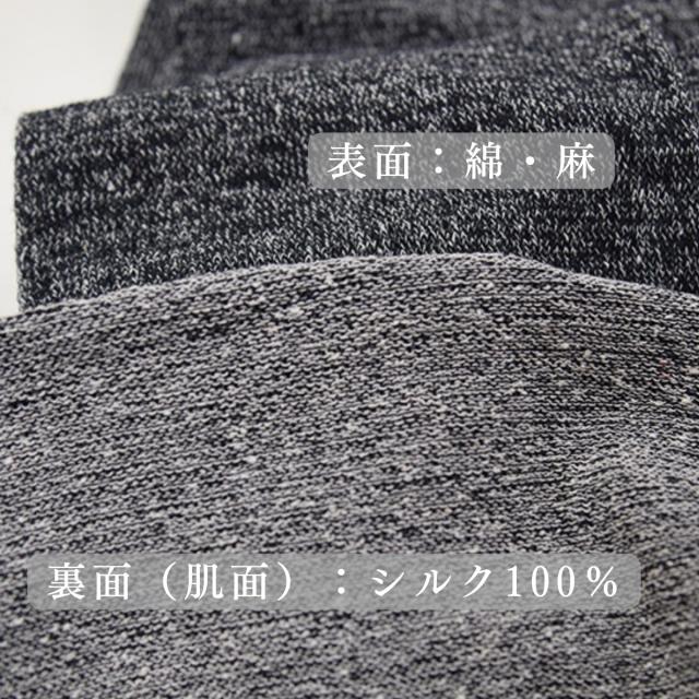 お肌の汗をシルクが素早く吸収し、表の綿麻が空気中に発散しますので、常にサラサラ快適にお過ごしいただけます。
