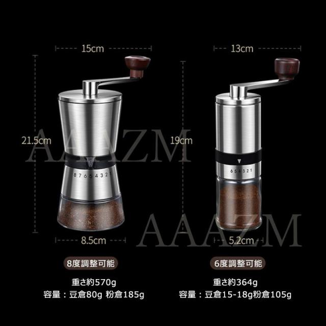 6度調整可能--5.2*19*13cm--豆倉容量:15〜18g--コーヒー粉倉容量:105g--本体重量364g