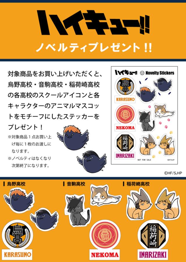 ハイキュー!!に登場する「烏野高校」「音駒高校」「稲荷崎高校」「梟谷学園』のキャラクターマスコットが刺繍されたデザイン。