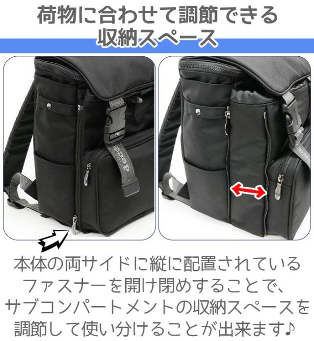 サイドのファスナーで、サブコンパートメントの容量を調整可能。荷物の量に合わせて収納量とシルエットを変化させられます。