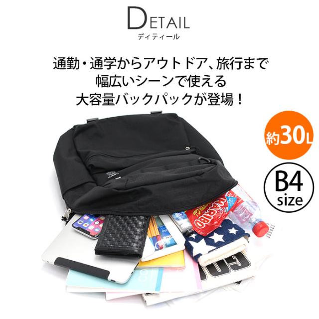 約30Lの大容量設計で、A4はもちろんB4サイズまで対応し、ノートや着替えも入る通勤、通学に安心のサイズです。