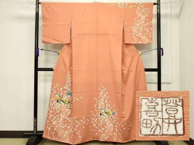 平和屋本店■極上 人間国宝・羽田登喜男 訪問着 鴛鴦 たたき染め 金銀彩 三越扱い 黄丹色地 逸品 未使用 CZAA1322s5