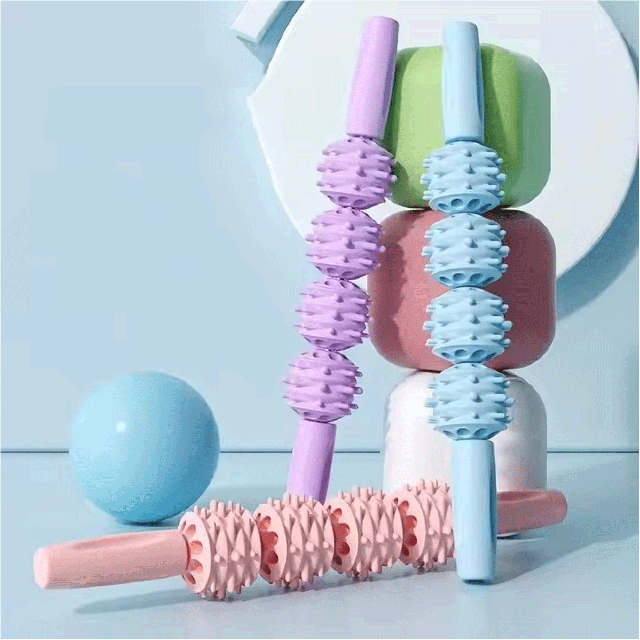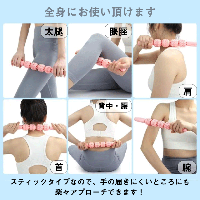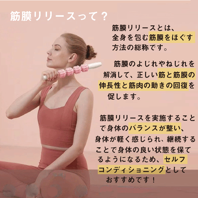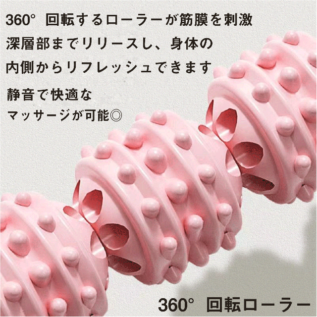 360°回転するローラーが筋膜を刺激し深層部までリリース、身体の内側からリフレッシュできるマッサージスティックです。