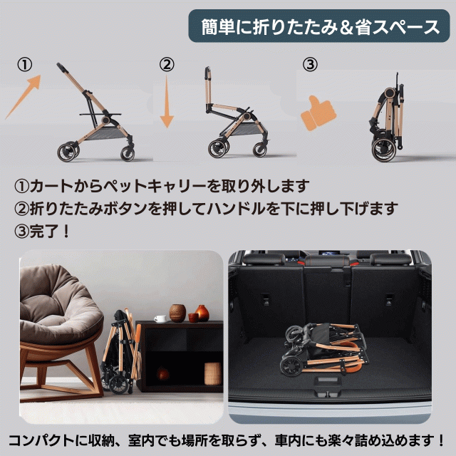 対面式で簡単にコンパクトに折り畳めるので、ペットとのお出かけも楽々♪