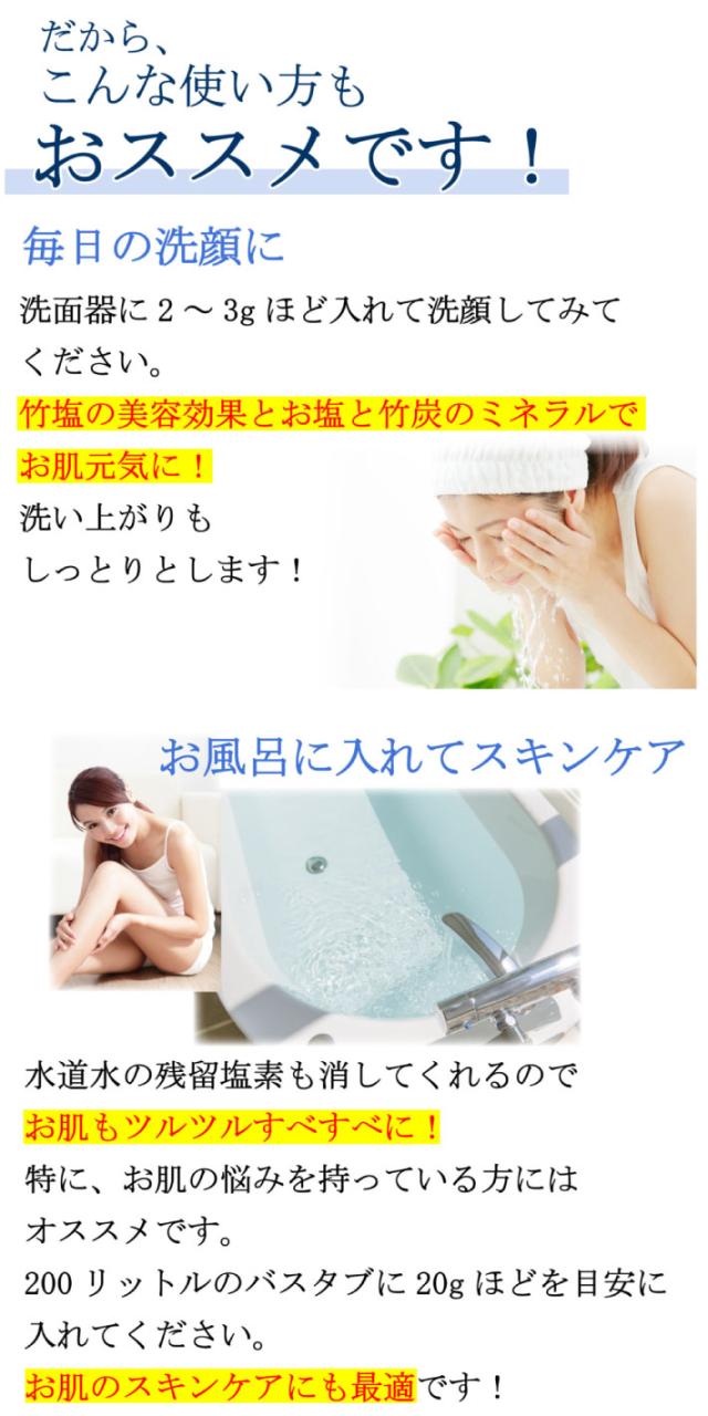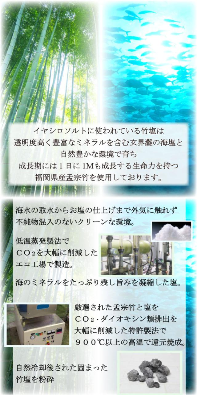 味も健康もランクアップ!強力な還元力を備えた、国産100%の竹塩。旨みに富んだ海塩(佐賀県産)と竹(福岡県産)からの恵みを、料理はもちろんスキンケアにもお使いください。