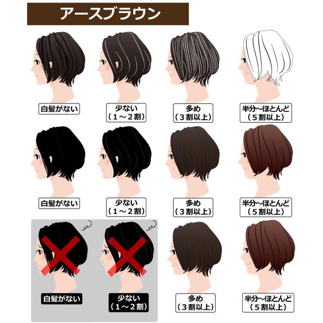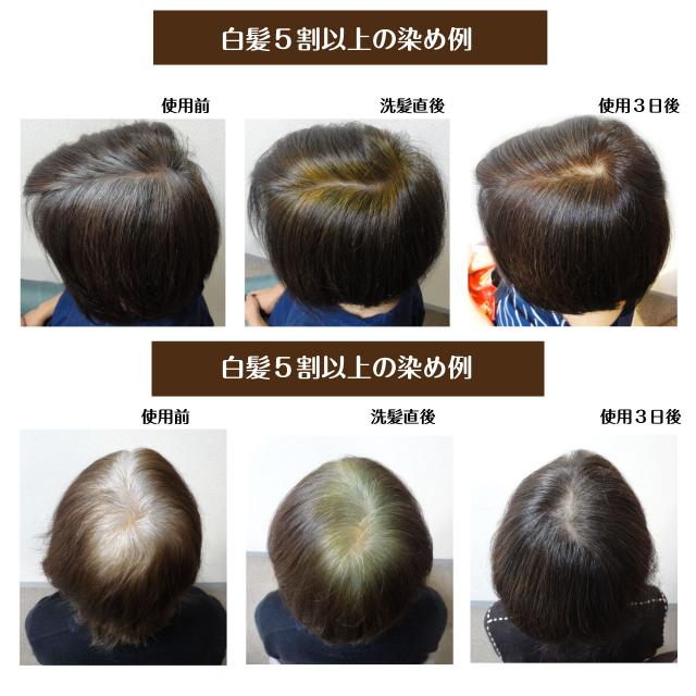 仕上がり…白髪が自然な茶色に染まり、黒髪はやや暗くなります。