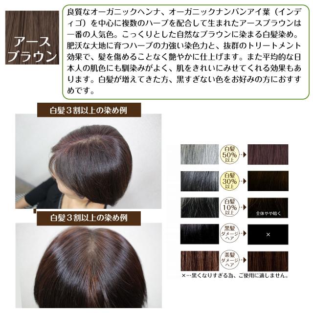 良質なオーガニックヘンナ、オーガニックナンバンアイ葉(インディゴ)を中心に複数のハーブを配合して生まれたアースブラウンは一番の人気色。こっくりとした自然なブラウンに染まる白髪染め。肥沃な大地に育つハーブの力強い染色力と、抜群のトリートメント効果で、髪を傷めることなく艶やかに仕上げます。また平均的な日本人の肌色にも馴染みがよく、肌をきれいにみせてくれる効果もあります。白髪が増えてきた方、黒すぎない色をお好みの方におすすめです。