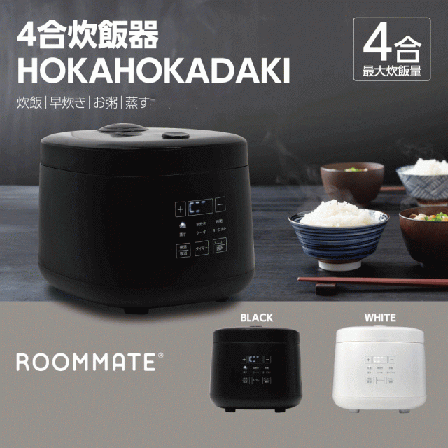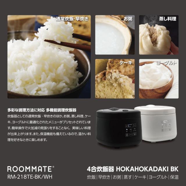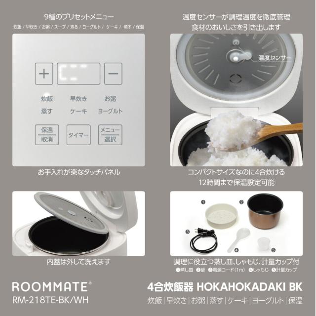 4合炊飯器 HOKAHOKA炊き RM-218TE 2色 ブラック ホワイト ROOMMATE 多機能調理炊飯器 通常炊飯 早炊き お粥 蒸し料理 ケーキ ヨーグルト 保温機能 簡単操作 タッチパネル 温度センサー 送料無料