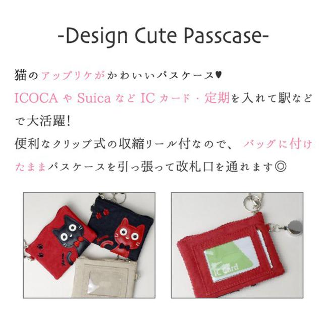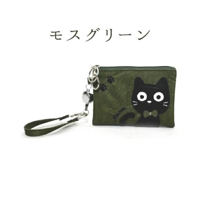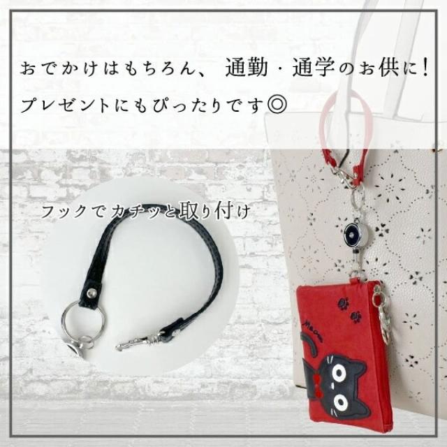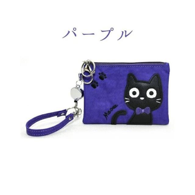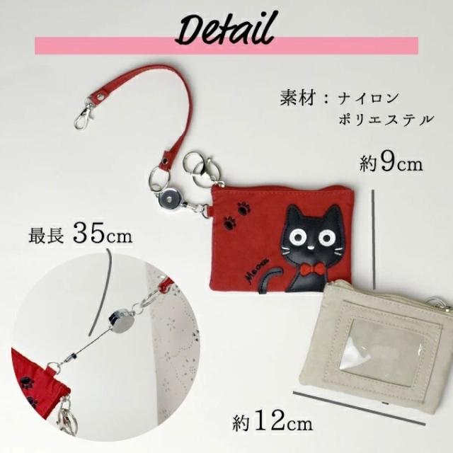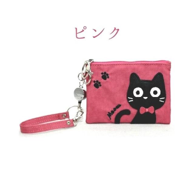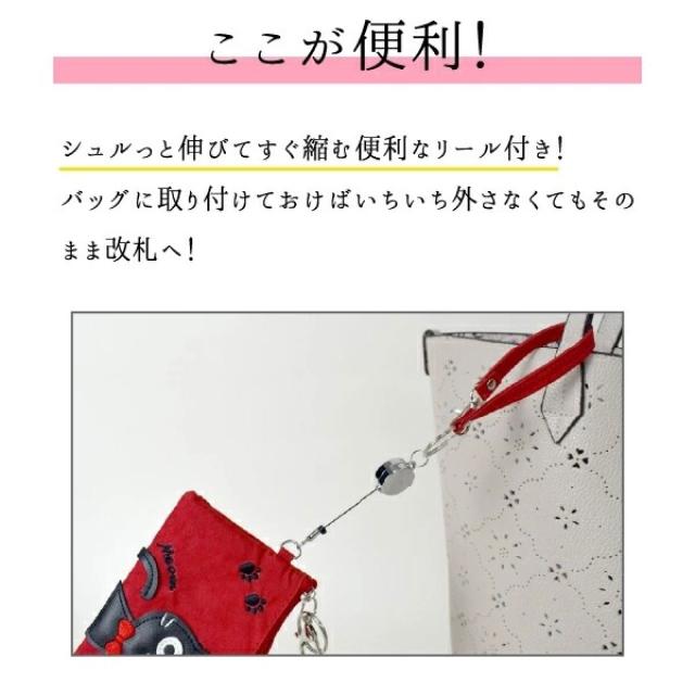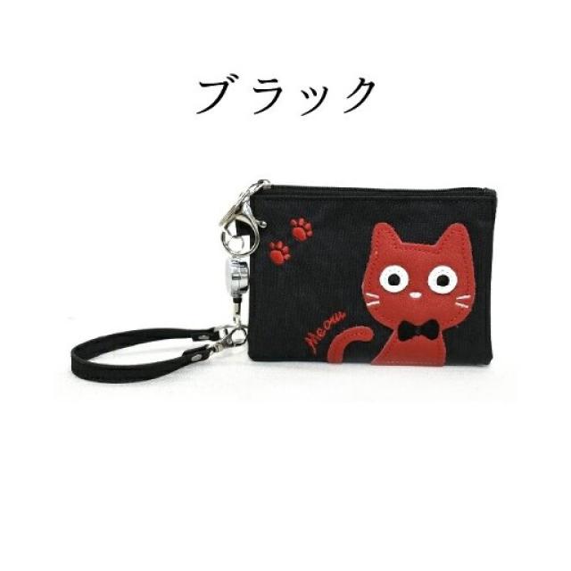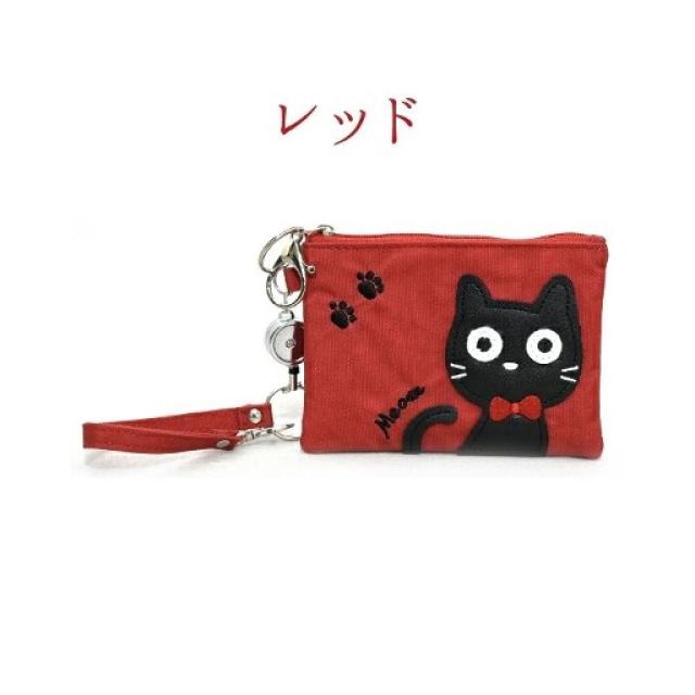 ねこ柄 カードケース 6色 ブラック グリーン レッド パープル ベージュ ピンク 大容量 リール付き レディース 定期 ICカード 学生証 社員証 カードホルダー 猫 アップリケ 縦9×横12cm 送料無料