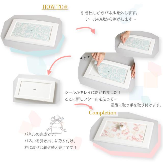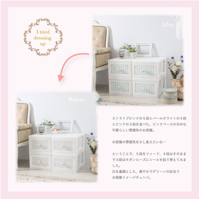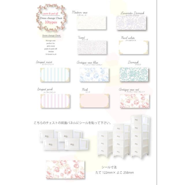 リルデココ ドレスチェンジチェストの着せ替えシールです。ストライプ、ダマスク、ローズなど、豊富な新デザインの追加により、お部屋をさらにコーディネートできます!