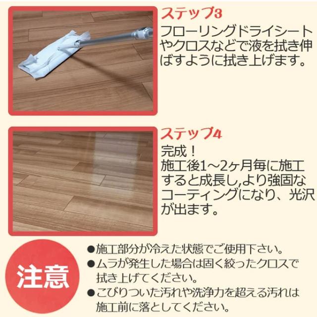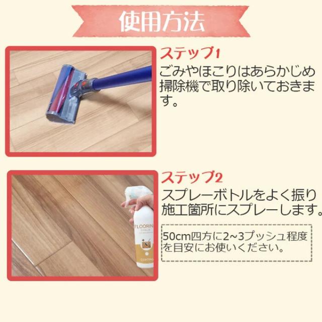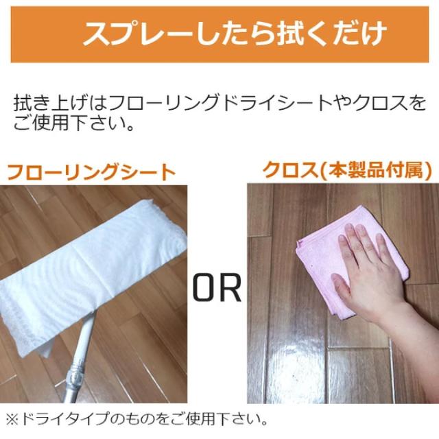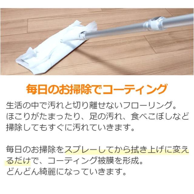 簡単お手軽なフローリングコーティングスプレー。スプレーして拭くだけ!クリーナーとコーティングが同時にできます。ご自宅だけでなく、事務所や店舗のフロアにもおすすめです。