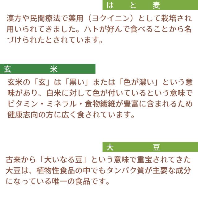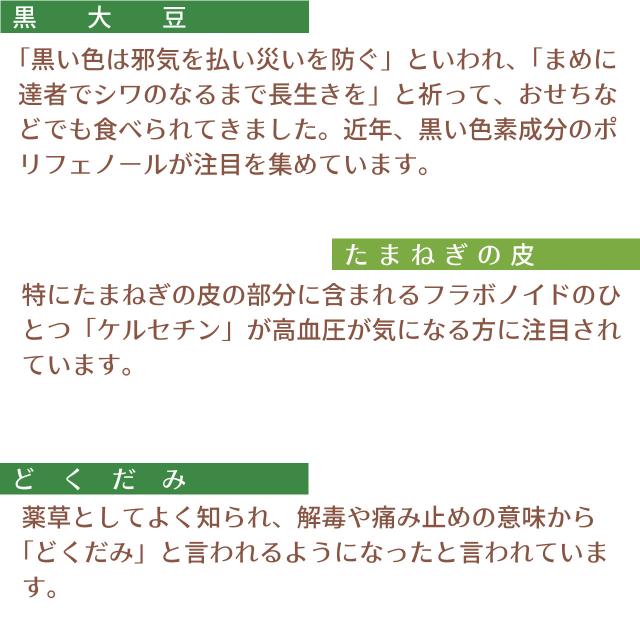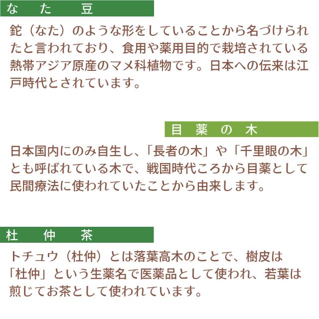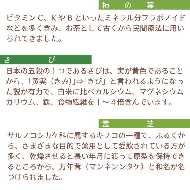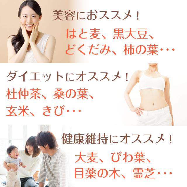 大麦、はと麦、玄米、大豆、黒大豆、たまねぎの皮、どくだみ、熊笹、びわ葉、桑の葉、なた豆、目薬の木、杜仲茶、柿の葉、きび、霊芝