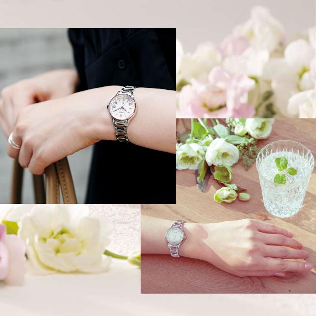 女性の肌を明るく美しく魅せるシチズンだけの「サクラピンク?」。どんなスタイルにも合わせやすい、上品で洗練されたベーシックなデザイン、クロスシー Basic collection