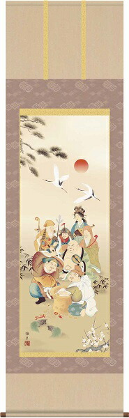 【お得クーポン配布中】 掛軸/慶祝・縁起画/七福神/七福神/鵜飼雄平/竹翠会/洛彩緞子本表装/尺五サイズ幅54.5cm/桐箱畳紙収納/表装品質十年保証