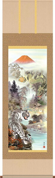 【お得クーポン配布中】 掛軸/開運画/開運龍・虎 開運四神龍虎図/茂木蒼雲/草夕会 洛彩緞子本表装/尺三サイズ幅44.5cm/化粧箱収納/表装品質十年保証